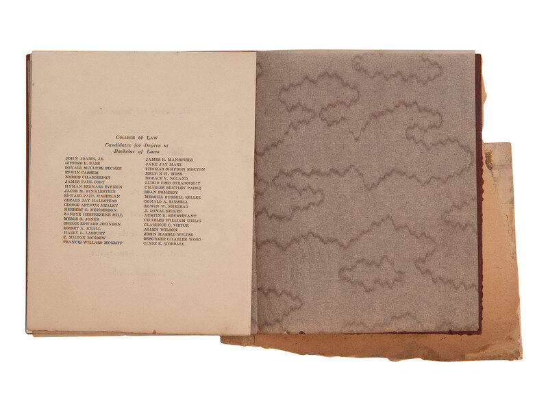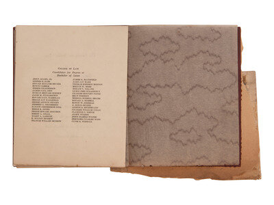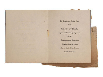 University of Nebraska College of Law graduation invitation issued to Zanzye H. Hill. 4 1/4 x 5 1/4 in. miniature booklet comprising 3 printed pages sewn into original card wrappers with "University of Nebraska 1869-1929" on front and printed portrait of Hill laid down on inner wrapper. The entire booklet is mounted to a torn fragment of a scrapbook leaf with an envelope on verso.