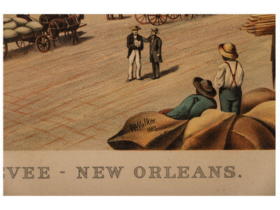 27 1/2 x 37 1/2 in. lithograph (including margins), housed in period frame, 35 1/2 x 45 1/2 in. Signed in lower margin of print, "W. Walker, 1883," with title and publication information printed in lower margin below print. A highly detailed rendering of a vibrant New Orleans port, focusing on a large pier filled with piles of goods and wagons loaded with cargo. Black male subjects of varying ages are visible in the foreground resting on piles of sacks, while two white men stand near the center, deep in conversation. Numerous steamboats docked along the Mississippi River can be seen in the background.