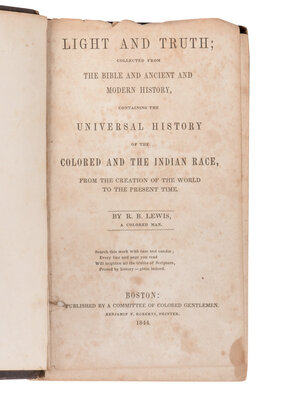 LEWIS, Robert Benjamin (1802-1858). Light and Truth: Collected from the Bible and Ancient and Modern History Containing the Universal History of the Colored and Indian Race from the Creation of the World to the Present Time. Boston: Published by a Committee of Colored Gentlemen, 1844.