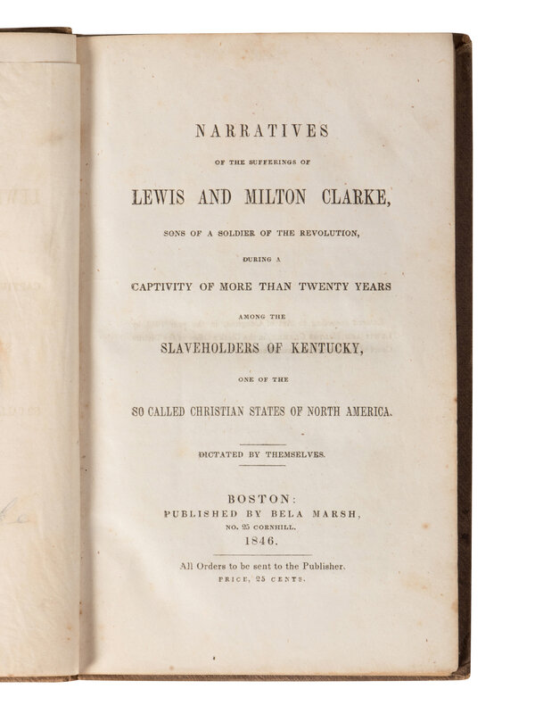 CLARKE, Lewis (ca 1812-1897) and Milton (1817-1901). Narratives of the Sufferings of Lewis and Milton Clarke, Sons of a Soldier of the Revolution, During a Captivity of More Than Twenty Years... Boston: Bela Marsh, 1846.