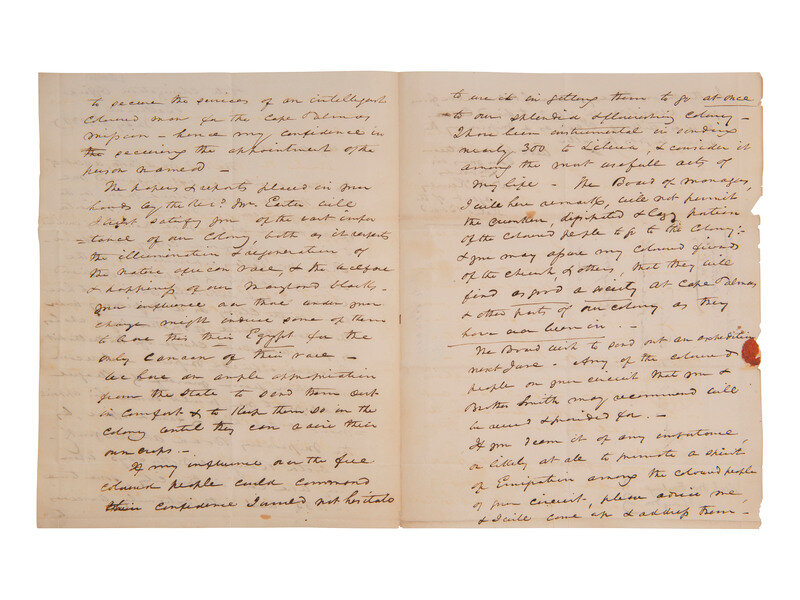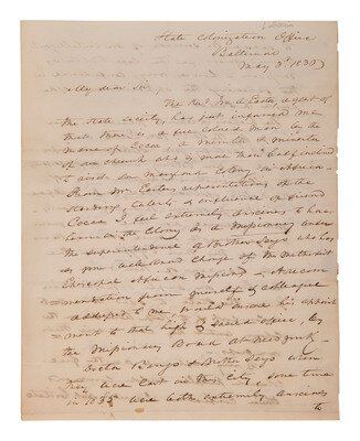 McKenney then writes: "The papers & reports placed in your hands by the Rev.d Mr. Easter will I trust satisfy you of the vast importance of our colony, both as it respects the illumination & regeneration of the native African race, & the welfare & happiness of our Maryland black. Your influence over those under your charge might induce some of them to leave this their Egypt for the only Canaan of their race. We have ample appropriation from the state to send them out in comfort & to keep them so in the colony until they can raise their own crops."