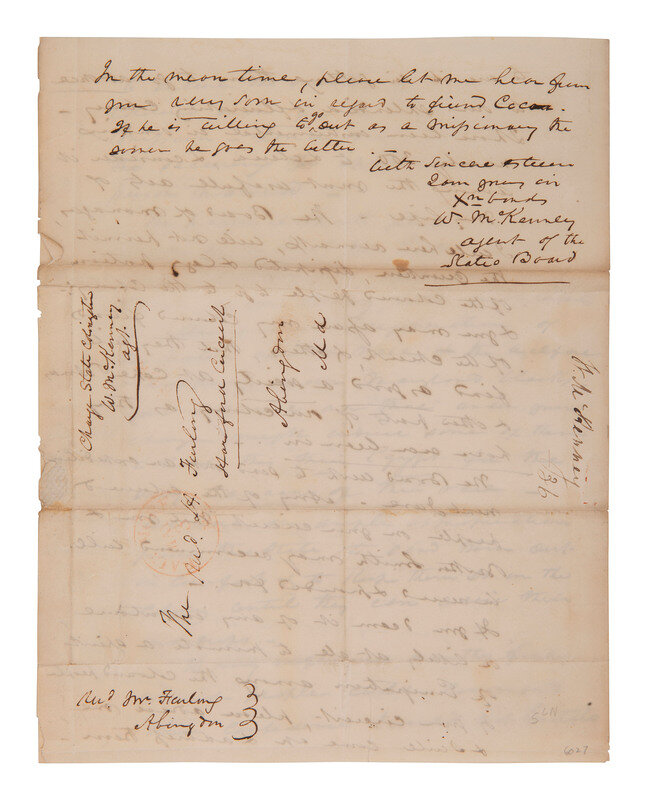 McKenney tells his recipient that Ira Easter, another agent of the State Colonization Society, informed him of a "free colored man by the name of Cocoa," who wishes to visit the Maryland colony in Africa as a missionary. He hopes to secure Rev. Furlong's recommendation to secure Cocoa's appointment as such.