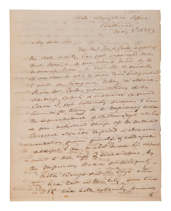 [LIBERIA]. Letter from an American Colonization Society agent regarding a freeman named Cocoa. 1836.