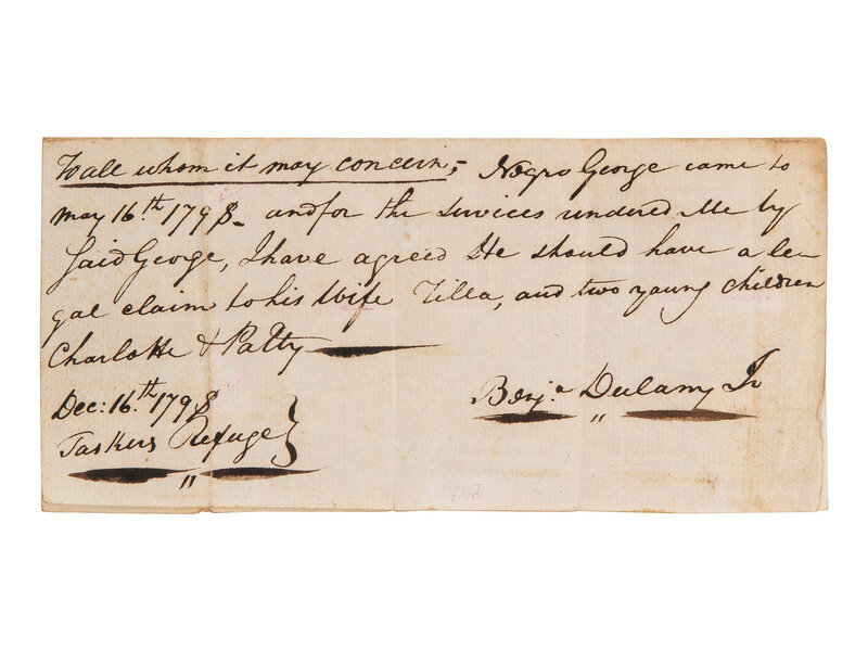 In full: "To all whom it may concern; Negro George came [to?] May 16th 1798. and for the services rendered me by said George, I have agreed He should have a legal claim to his Wife Tilla, and two young children Charlotte & Patty. / Dec: 16th 1798, Taskers Refuge."