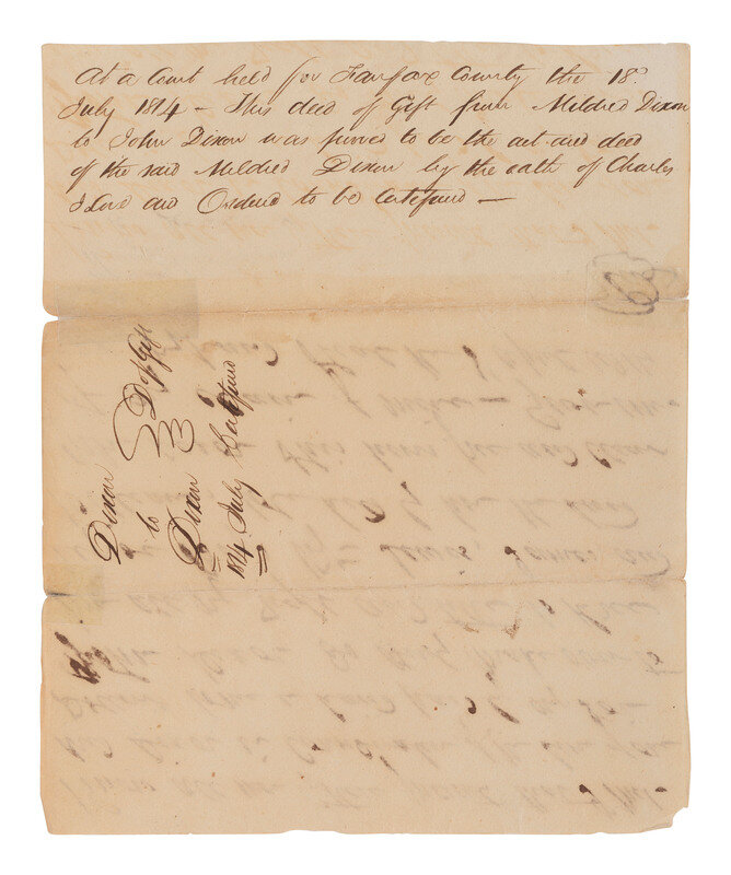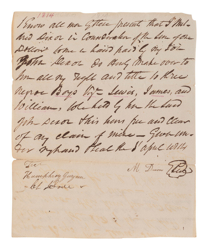 In part: "Know all men by these present that I Mildred Dixon in consideration of the sum of one dollar to me hand paid by my son John Dixon do [indecipherable] make over to him all my right and title to three negroe Boys viz. Lewis, James, and William..."