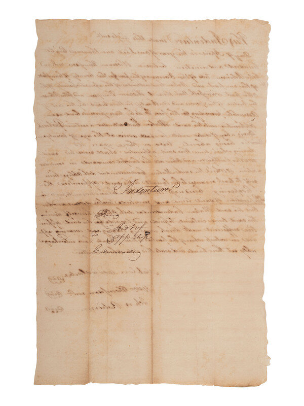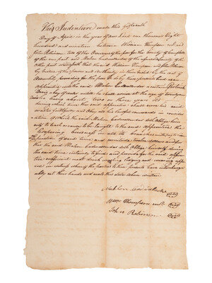 Manuscript indenture of apprenticeship between William Thompson and John Robinson, "two of the Overseers of the Poor for the County of Campbell [Virginia] of the one part and Mahlon Cadwallader of the aforesaid county of the other part," binding as an apprentice unto Cadwallader "a certain Patrick Davis a boy of couler [sic] until he shall arrive at the age of twenty-one being [now] about two or three years old...." Cadwallader, a white cooper, agrees to care for the free African American child and "teach or cause to be taught to the said apprentice the coopering business...and to pay him at the expiration of said time and servitude twelve dollars...." Campbell County, Virginia, 15 April 1819. Approx. 7 1/2 in. x 12 in. Signed by Mahlon Cadwallader, William Thompson, and John Robinson.