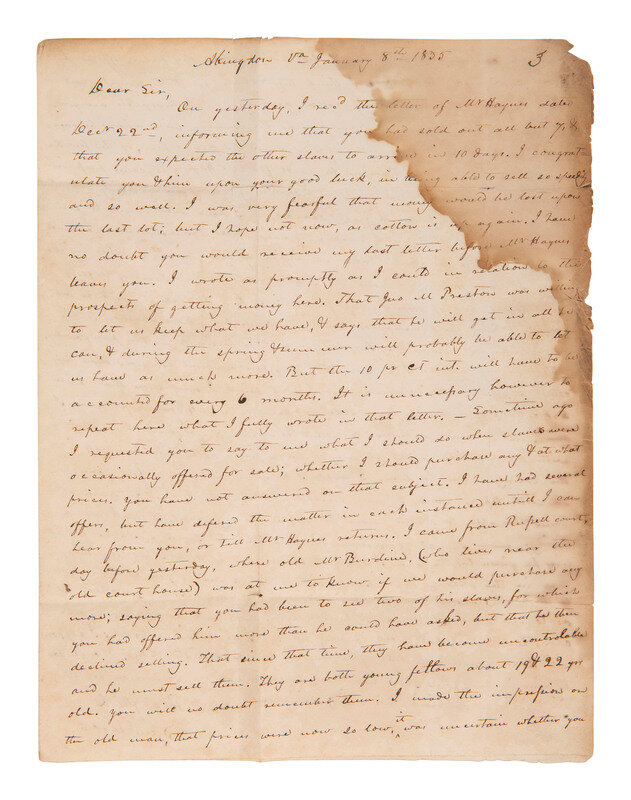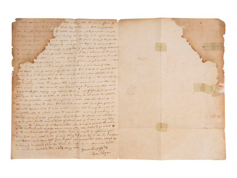 The letters offered here demonstrate the unflinching and unapologetic manner in which enslavers engaged in the brutal business of slave trading. Both Haynes and Logan were Virginia lawyers who simultaneously dealt in slave trading. Interestingly, Samuel Logan may have named a child after the slave trader to which he sent this letter. Joseph Meeks Logan (1836-1869) was born to Samuel Logan and his wife the year after Logan penned this letter to Meeks.