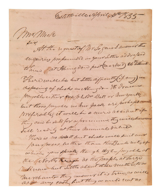 [ENSLAVEMENT]. 2 letters to slave trader Joseph Meek regarding the current market. Virginia, 1835.