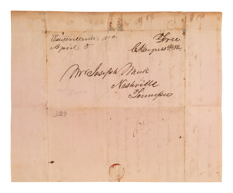 HAYNES, Christopher (1806-1844). Autograph letter signed ("C. Haynes") as Postmaster of Estillville, Virginia. Addressed to Mr. Joseph Meek of Nashville, Tennessee. Estillville, Scott County, VA, 4 April 1835. 3pp, bifolium, addressed on terminal leaf. Free franked by Hayes using his privileges as postmaster.