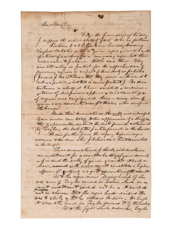 "Thos. Berry / Assault upon his negroes," [n.p.], [1846?]. 4pp, 8 x 13 in., bifolium. Attorney "H.W. Davis" outlines details of the assault by "Taylor & Webster" upon persons enslaved by Thomas Berry, and provides the arguments to be made supporting the illegality of their actions. Accompanying this letter is a manuscript note, likely in the hand of Thomas Berry, approx. 7 1/2 x 4 1/2 in., partly in ink and partly in pencil, which seems to describe a second incident in which Taylor and Webster came to Berry's home and again violently assaulted an enslaved man and woman.