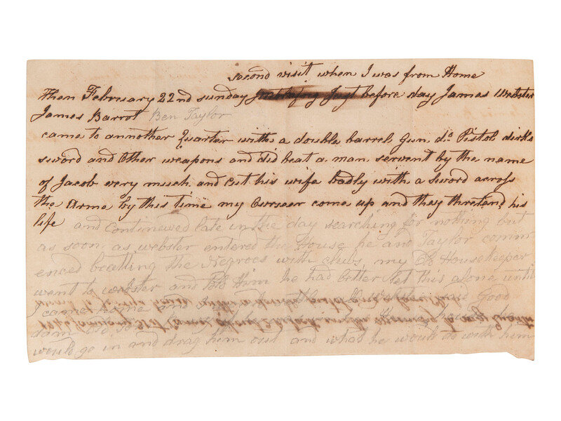 The manuscript note reads, in part: "Second visit when I was from Home / Then February 22nd Sunday Just before day James Webster James Barrot Ben Taylor came to annother Quarter with a double barrel gun Do. Pistol dirks sword and other weapons and did beat a man servant by the name of Jacob very much and cut his wife badly with a sword across the arms by this time my overseer came up and they threatened his life and continued late in the day searching for nothing but as soon as Webster entered the house he and Taylor commenced beating the Negroes with clubs...."