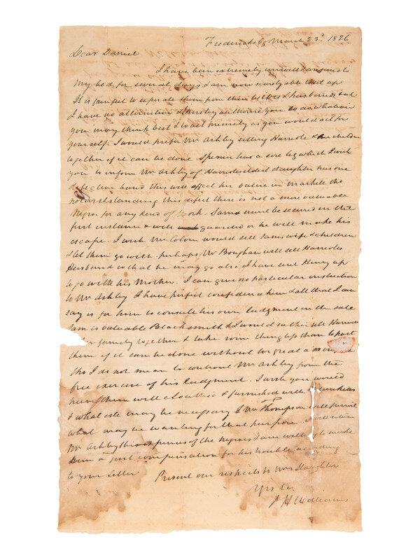 "It is painful to seperate [sic] all them from their wives & husbands but I have no alternitive [sic]. I hereby authorize you to do whatever you may think best & to act precisely as you would act for yourself. I would prefer Mr. Ashby selling Harriet & her children together if it can be done..."