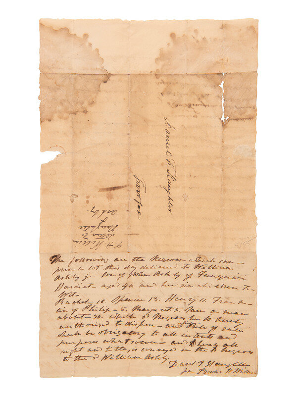 One page, 7 x 12 3/8 in. Verso with ANS from Daniel F. Slaughter to business associate William Ashby, listing enslaved persons to be sold by name and age. Address panel also on verso.