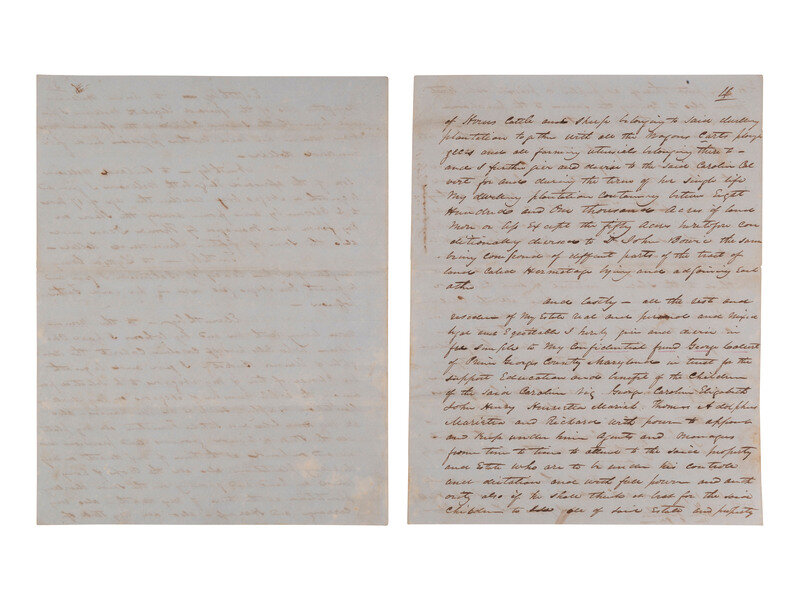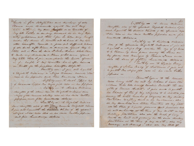 "Fourthly - I give and bequeath to Elizabeth Williams a negro woman named 'Nan' now in her possession...Fifthly - to Sarah Tippet wife of Edward Tippet one negro girl now in her possession. Sixthly - to Alvina Williams one negro girl named Milly now in her said mother's possession...Seventhly - to Elizabeth Williams [indecipherable] daughter also of the above named Elizabeth Williams I give and bequeath the oldest child of the aforesaid negro man now also in her said mother's possession...Eighthly - to Anna Williams...I give and bequeath the second child of the aforesaid negro man now in her said mother's possession...Ninthly - to Richard Williams...I give and bequeath a negro boy under the age of 17 years to be chosen by him from among the slaves on my farm now managed by Thomas Dean...Tenthly - to Lydia Crary daughter of John Crary of Baltimore I give and bequeath one negro girl now in her said father's possession. Eleventhly - to the woman now living with me and by whom I have children who calls herself Caroline Calvert the daughter of Eleanor Becket - I give and bequeath her choice of ten of my negroes to be selected from among the whole number of negroes on my dwelling plantation excepting such as are mechanics..."