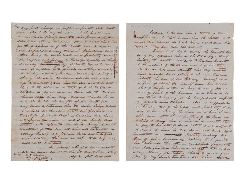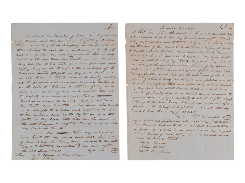 8 pages, 6 5/8 x 8 3/4 in. Docketed on terminal leaf. Includes 2 codicils dated 30 June 1824 and 14 October 1825.