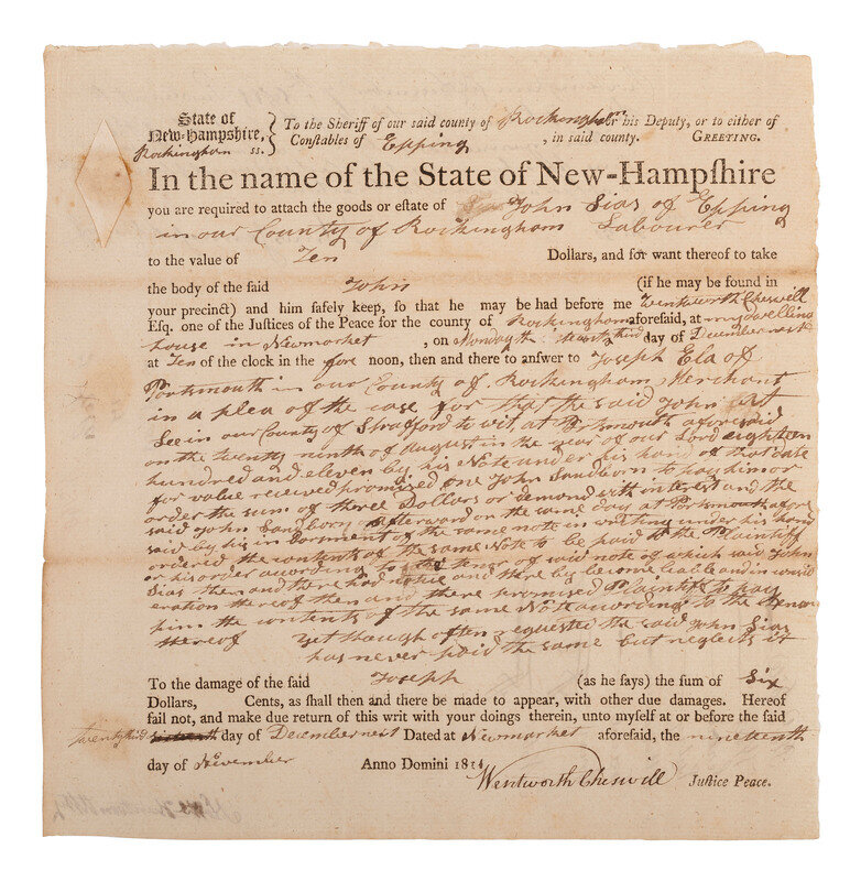 1p, 8 x 8 1/4 in. A legal writ issued by Cheswell ordering the Sheriff of Rockingham County, N.H. to bring John Sias before him at his home in New Market, N.H. to answer a complaint made by Joseph Ela of Portsmouth, N.H. for nonpayment of a $3 debt. Docketed on verso.