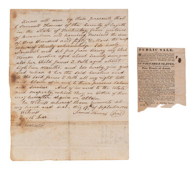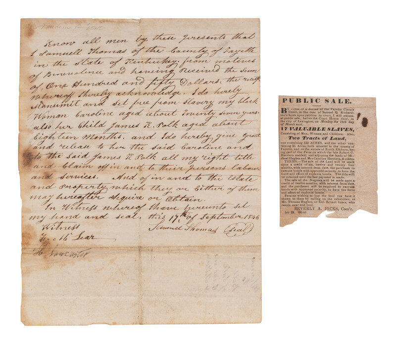[ENSLAVEMENT]. Manuscript manumission of an enslaved woman and child. Fayette Co., KY, 17 Sep 1846.