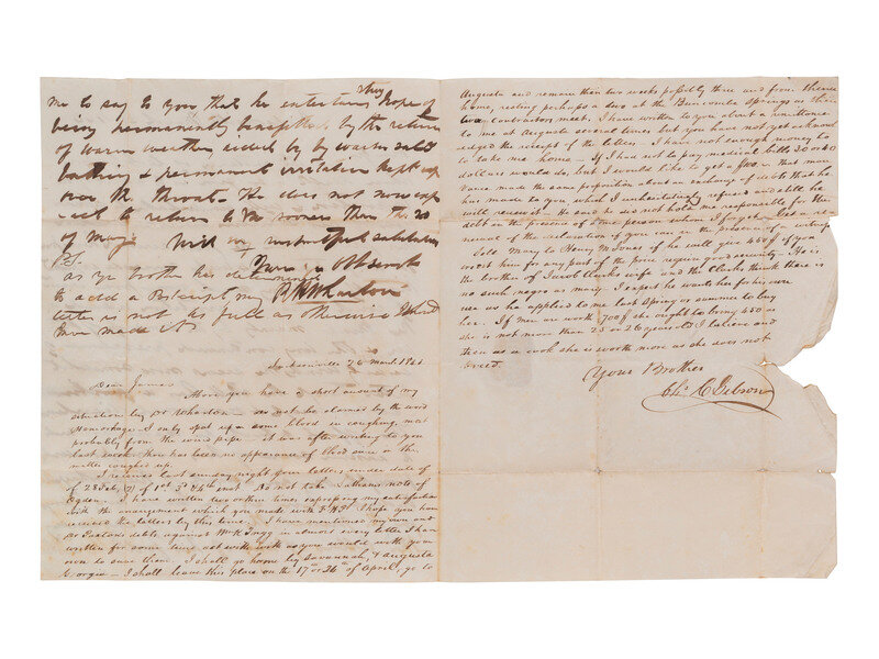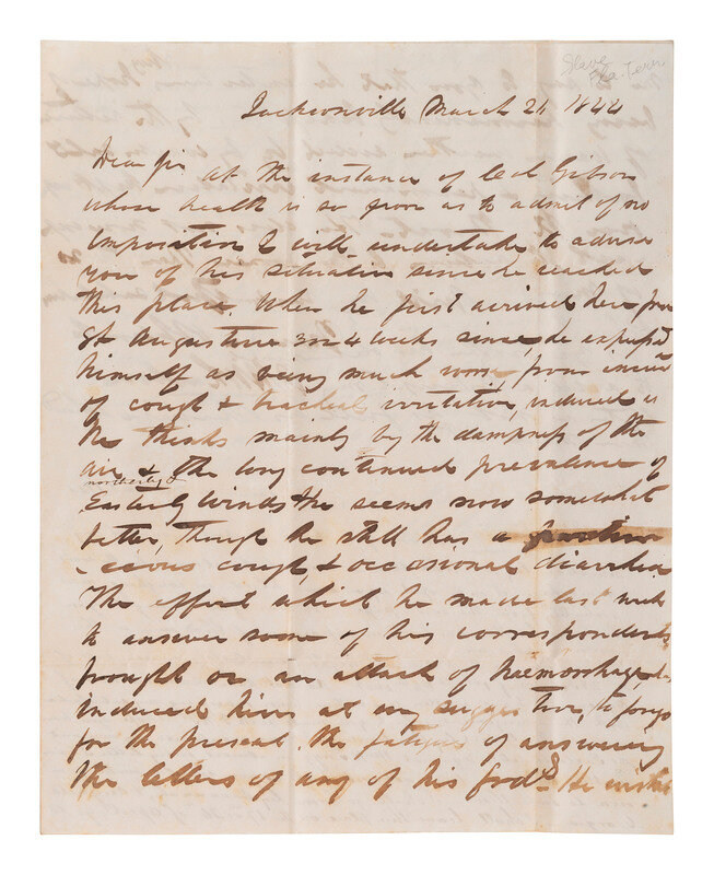 GIBSON, Charles C. ALS to his brother James Gibson. Jacksonville, [FL], 26 March 1844.