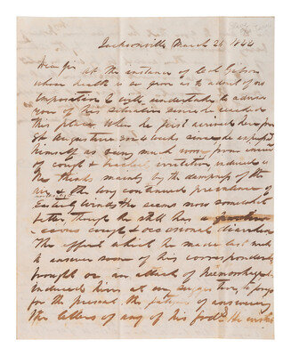 The text of Gibson's letter begins after another letter (dated March 1844) from his doctor describing his "poor" condition. Gibson's letter begins with a plea to his brother to "not be alarmed by the word Hemorrhage" in the doctor's note. He spends a few lines discussing his own health and then transitions into business, his plans to return home, and his own financial situation.