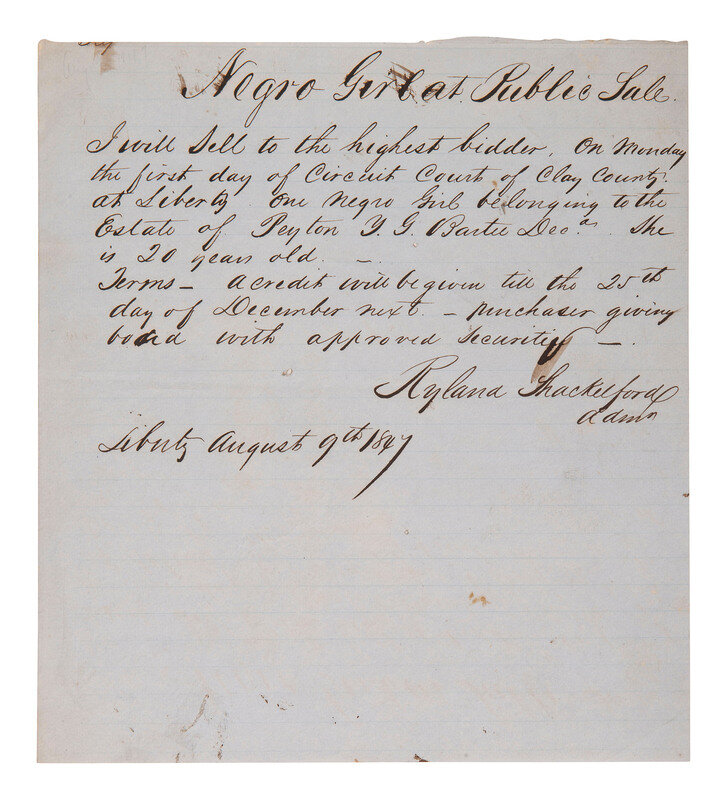 In full: "Negro Girl at Public Sale. / I will sell to the highest bidder, on Monday the first day of Circuit Court of Clay County at Liberty one negro Girl belonging to the Estate of Peyton Y. G. Bartie[?] Dec.d. She is 20 years old. / Terms - a credit will be given till the 25th day of December next. - purchaser giving bond with approved security. / Ryland Shackelford, Admin. / Liberty August 9th 1847."