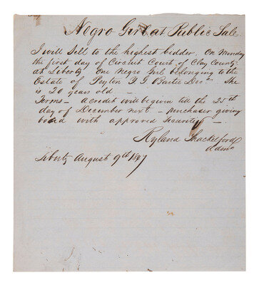 [ENSLAVEMENT] Manuscript announcement of the public sale of a "negro girl." Liberty, MO, 9 Aug. 1847