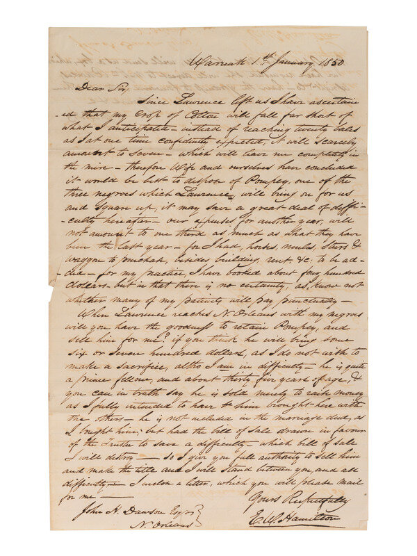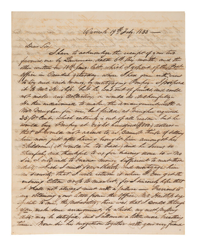 "...I have ascertained that my crop of cotton will fall far short of what I anticipated. Instead of reaching twenty bales as I at one time confidently expected, it will scarcely amount to seven - which will leave me completely in the mire. Therefore wife and ourselves have concluded it would be best to dispose of Pompey, one of the three negroes which Lawrence will bring on for us...When Lawrence reaches N. Orleans with my negroes will you have the goodness to retain Pompey, and sell him for me? If you think he will bring some six or seven hundred dollars, as I do not wish to make a sacrifice, altho I am in difficulty - he is quite a prince fellow, and about thirty five years of age, & you can in truth say he is sold merely to raise money as I fully intended to have him brought here with the others..."