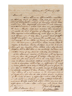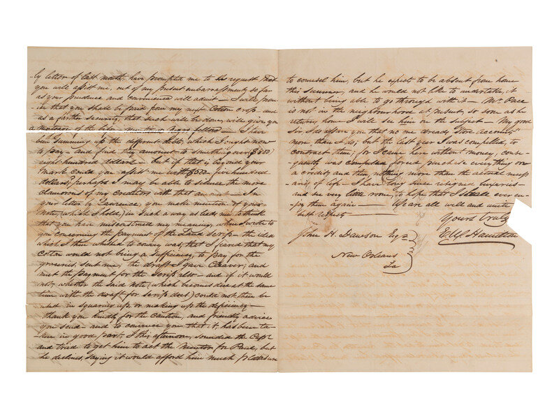 Hamilton continues with his financial woes, noting that he had tried to raise funds by mortgaging Pompey rather than selling him, writing, "...I cannot think of selling him now, just after having brought him amongst his children (it would be too bad) and he seems so cheerful, and thankful to us for having done so..." He continues on about other ways to make ends meet and satisfy his creditors, including asking his recipient to provide some assistance. He writes, "I will promise that you shall be paid from my next cotton crop - and as a farther [sic] security, that such will be done, will give you a mortgage of the before mentioned negro fellow."
