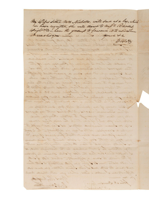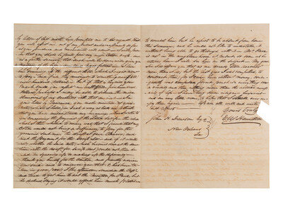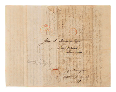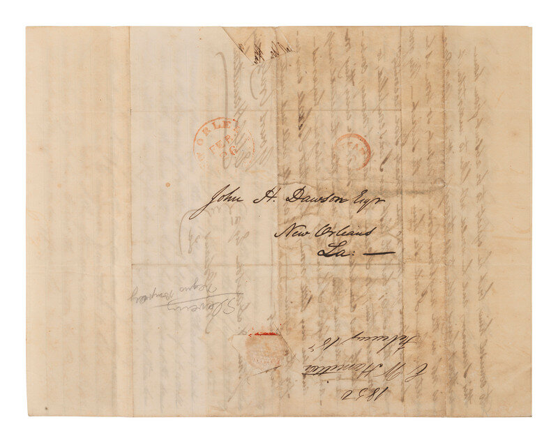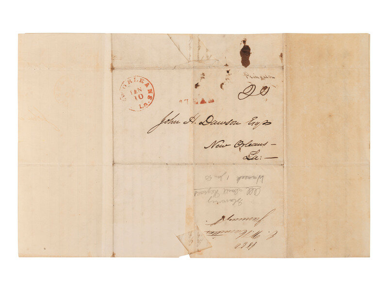 1 1/4 pages, on bifolium, 7 7/8 x 12 3/8 in., creased along folds, some separations and clipped losses, occasional spotting/staining. Address panel on terminal leaf with postmark at New Orleans.