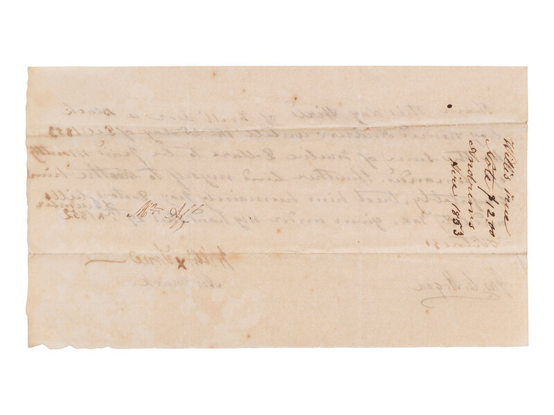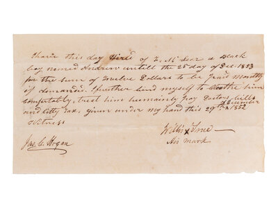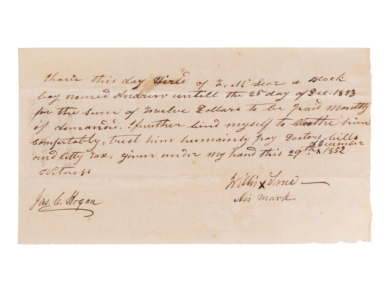 Willis True affixes "His mark" to the receipt indicating that he has hired "a Black boy named Andrew untill the 25 day of Dec. 1853 for the sum of Twelve Dollars to be paid monthly if demanded," and further agrees to "Cloathe him comfortably, treat him humainly pay Doctor's bills and Citty tax...." Witnessed by "Jas. C. Hogan." Docketed on verso.