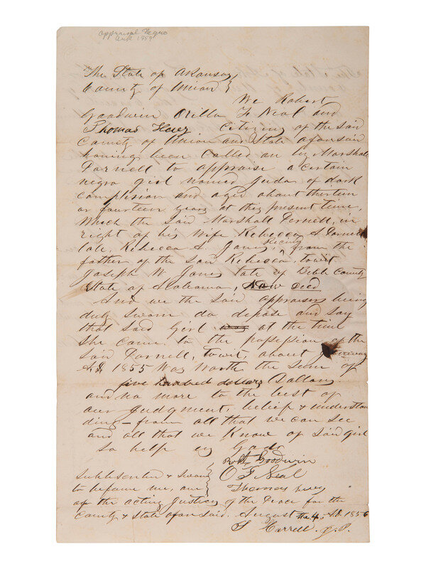 "We...having been called on by Marshall Parnell to appraise a certain negro girl named Juda of dark complexion and aged about thirteen or fourteen years at this present time...do depose and say that said girl at the time she came to the possession of the said Parnell, to wit, about January A. D. 1855 was worth the sum of five hundred dollars Dollars [sic] and no more to the best of our judgment, belief & understanding - from all that we can see and all that we know of said girl so help us God."