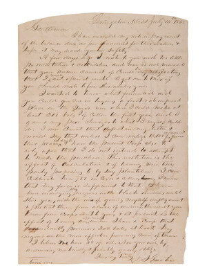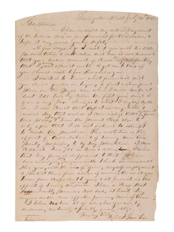 ALS addressed to unknown "Gentlemen." Livingston, MS, 14 July 1858.