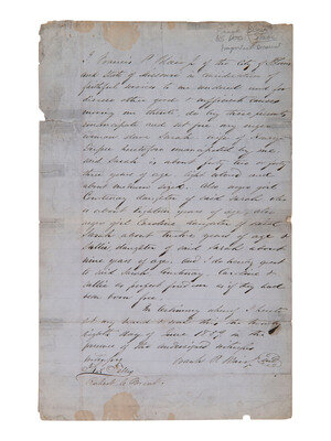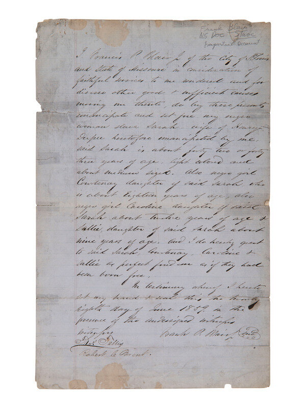 "I, Francis P. Blair Jr of the city of St. Louis and state of Missouri in consideration of faithful services to me rendered and for diverse other good & sufficient causes moving me thereto, do by these presents emancipate and set free my negro woman slave Sarah - wife of Henry Dupee heretofore emancipated by me, said Sarah is about forty two or forty three years of age, light colored and about medium sized. Also negro girl Courtenay daughter of said Sarah, who is about eighteen years of age, also negro girl Caroline daughter of said Sarah about twelve years of age & Sallie, daughter of said Sarah about nine years of age. And I do hereby grant to said Sarah, Courtenay, Caroline & Sallie a perfect freedom as if they had been born free."