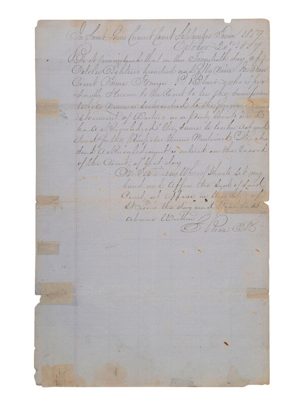 One page, 8 x 12 1/2 in. Verso bears official court acknowledgement with St. Louis County Circuit Court seal embossed to center left.