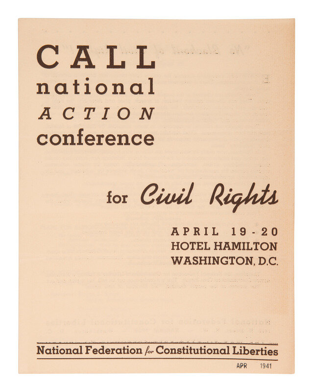 Printed program for the "Call National Action Conference for Civil Rights, April 19 - 20, Hotel Hamilton, Washington, D.C." Washington, DC: National Federation for Constitutional Liberties, 1941.