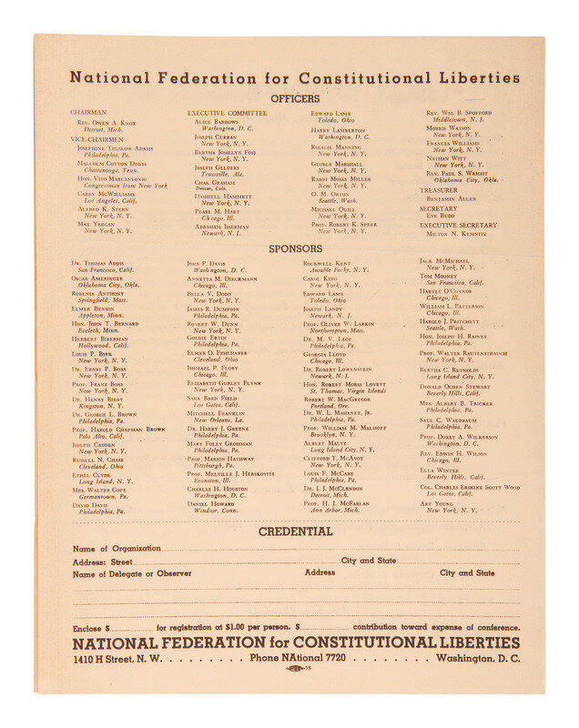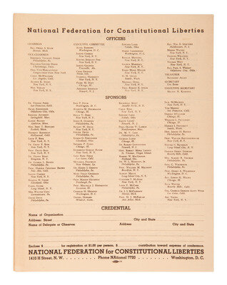 Introductory text for the conference includes the following declaration: "Everywhere the fight for civil rights, though different in detail, in essence is the same. The time has now come to pool our experiences and ideas. Systematic strategy is required on a national scale to defend Constitutional liberties. Therefore, the National Federation for the Constitutional Liberties is calling a National Action Conference on Civil Rights. This is a conference, not for talk, but to plan and act. The masses of the people demand, 'No blackout of civil rights!'"