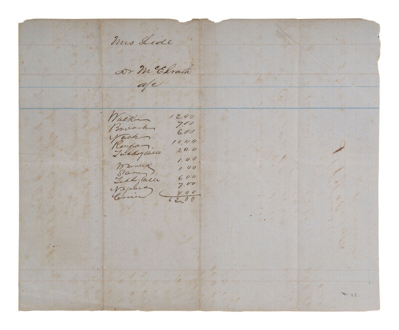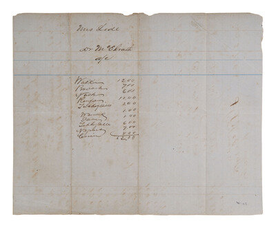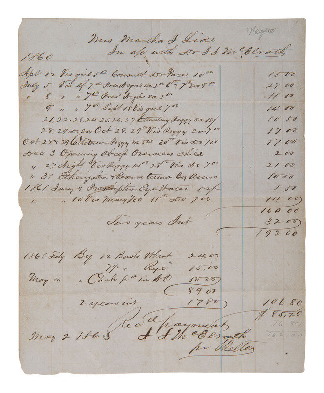 Account of Mrs. Martha J. Lide (1811-1880), with Dr. J.J. McElrath (dates unknown), [Ouachita County, Arkansas], 2 May 1863. 1p, 8 1/2 x 10 1/2 in. Receipt notes payment received and itemizes services including attending "Negroes" and "Opening abcess [sic] Overseers child." -- Account of George [?] W. Ashby with Dr. Strother J. Wallis, [n.p.], February - December 1861. 1p, approx. 6 1/2 x 9 in. Receipt totals fees for visits throughout the year including for "Visit and dressing wound for [negro] Clay," "Visit to negro boy hurt by colt," and "Visit & delivering placenta for Negro Martha." -- Account of Capt. G. Wallis with Dr. John Walker, [n.p.], January 1848. 1p, approx. 8 x 5 in. Receipt includes fees for multiple visits with "Negro woman."