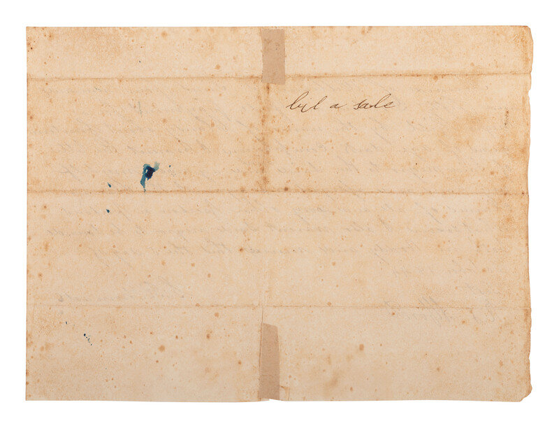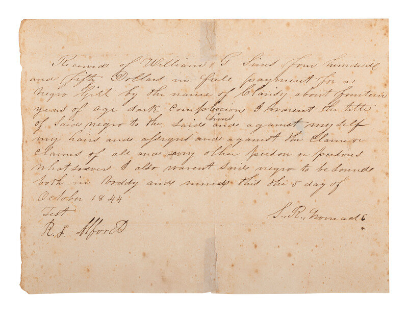 [With:] Bill of sale warranting receipt of payment by S.R. Nomade for an enslaved teenage girl: "Received of William G. Sims four hundred and fifty Dollars in full payment for a negro Girl by the name of Clarisy about fourteen years of age, dark complexion...." 5 October 1844, [n.p.].1p, approx. 8 x 6 in. (creasing at folds, scattered spotting, two minor tears with adhesive repair on verso).