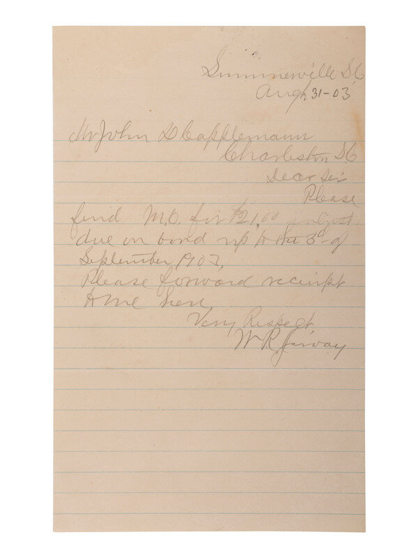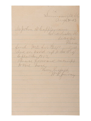 JERVAY, William R. (1847-1910), slave, soldier, South Carolina State Senator, Judge, and minister. Autograph letter signed ("W.R. Jervay"). 31 August [19]03, Summerville, S.C. 1p, 5 x 8 in., in pencil. Addressed to Mr. John Capplemann of Charleston, S.C. Jervay sends a $21 money order for payment due on a bond, and requests a receipt for the payment. Fine condition.