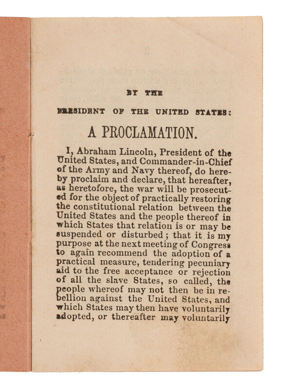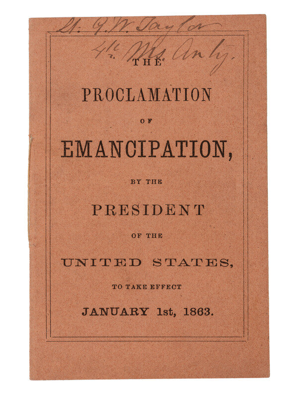 The Proclamation of Emancipation by the President of the United States, To Take effect January 1st, 1863. [Boston: John Murray Forbes, December 1862]. 32mo (2 1/4 x 3 1/4 in.), 7pp. Original printed light brown paper wrappers, thread binding (very light creasing, light dampstaining spots on rear cover). Identified in ink above title to "Lt. G.W. Taylor / 4th Ms Arty." The seventh printed edition of the preliminary version of the Emancipation Proclamation, and the only contemporary pamphlet printing.