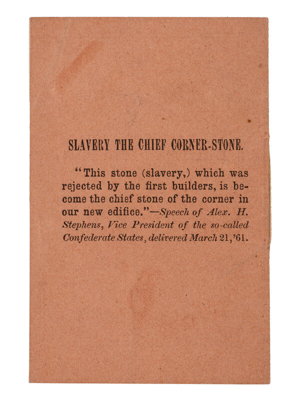 Lincoln's preliminary Emancipation Proclamation was dated 22 September 1862 while the revised, final document became official on 1 January 1863. This thin, miniature pamphlet contains the full text of the preliminary Emancipation Proclamation as issued by Abraham Lincoln, with a quote on back wrapper from Alex H. Stephens, "Vice President of the so-called Confederate States, delivered March 21, '61": "This stone (slavery), which was rejected by the first builders, is become the chief stone of the corner in our new edifice."