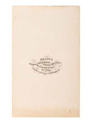 CDV on cardstock mount with Brady's New York imprint on recto and full imprint on verso. Captured by Brady on 8 January 1864, this likeness is often referred to as the "Solitary Pine" portrait, borrowing a phrase from Francis Grierson's comment that Lincoln "rose from his seat, stretched his long, bony limbs upward as if to get them into working order and stood like some solitary pine on a lonely summit."