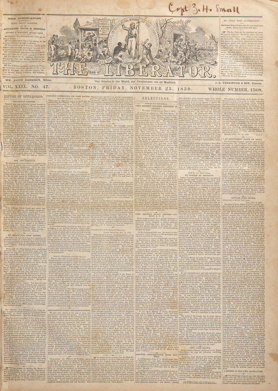 Boston: J.B. Yerrington & Son, ca 1859-1860s. Atlas folio. Collection of approximately 180 of issues of the abolitionist newspaper The Liberator. Complete from November 25, 1859 (Vol. XXIX No. 47) through December 26, 1862, followed by assorted issues from April 9, 1852 through November 18, 1859. Full green buckram, lightly soiled. Condition varies, scattered toning, stains, tears, or tape repairs; March 21, 1862 (Vol. XXXII, No. 12) issue disbound; ownership signature of "Capt. Z.H. Small" at top of most issues.