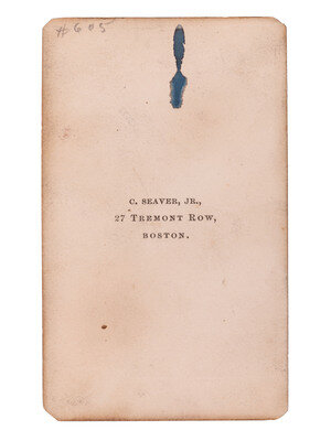 CDV on cardstock mount, standing portrait of William Lloyd Garrison posing with his hand in his coat. Boston: C. Seaver, Jr., ca 1860s. Signed on mount below image, "Wm. Lloyd Garrison."