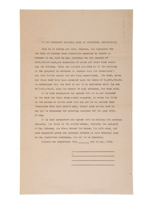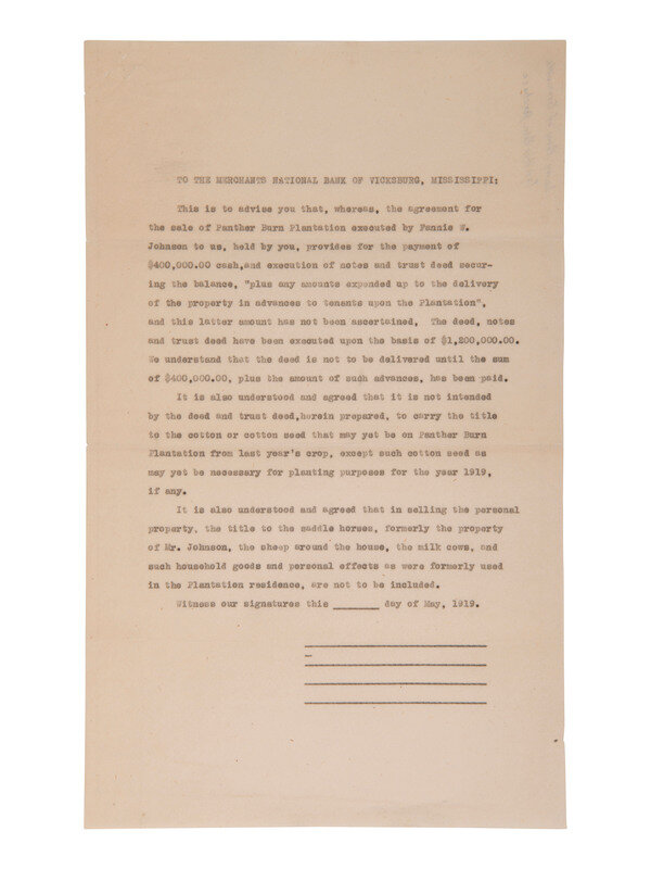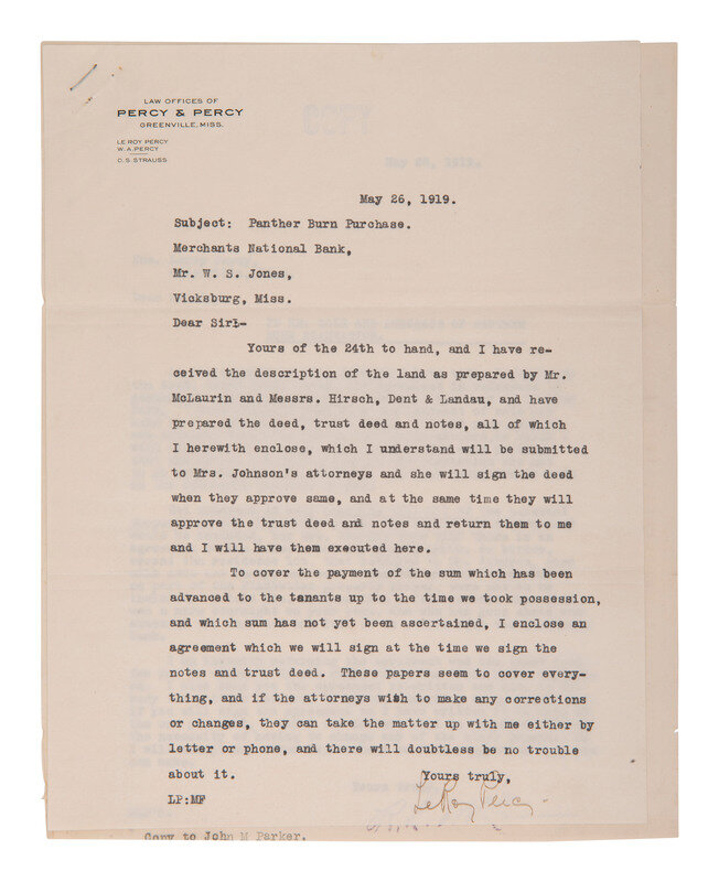 PERCY, LeRoy (1869-1929). Typed letter signed ("LeRoy Percy"), addressed to Mr. W.S. Jones, Vicksburg, MS. Greenville, MS, 26 May 1919. 1 page, 10 1/2 x 8 in. "Law Offices of Percy & Percy" letterhead. -- MCLAURIN (?), R.L. Typed letter with "copy" ink stamp and stamped signature ("R.L. McLaurin?"), addressed to Senator Leroy Percy, Greenville, MS. 26 May 1919. 1 page, 10 3/4 x 8 1/2 in. -- Typed document addressed to, "the Merchants National Bank of Vicksburg, Mississippi." 1 page, 14 x 8 1/2 in. In part: "This is to advise you that, whereas, the agreement for the sale of Panther Burn Plantation executed by Fannie W. Johnson to us, held by you, provides for the payment of $400,000.00 cash, and execution of notes and trust deed securing the balance, 'plus any amounts expended up to the delivery of the property in advances to tenants upon the Plantation'..."