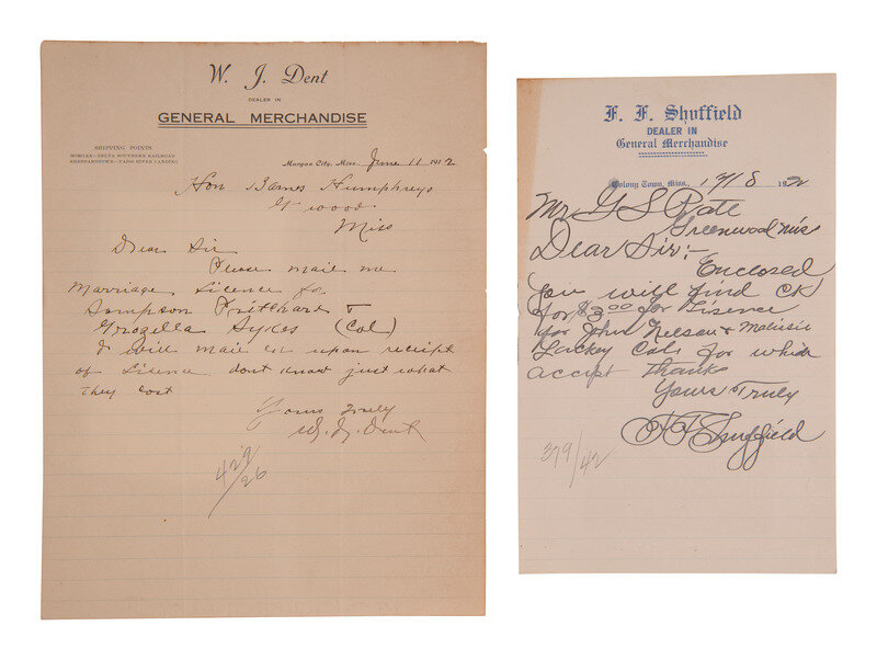 Autograph letter signed by W.J. Dent and addressed to the Hon. Barnes Humphreys, on letterhead "W.J. Dent Dealer in General Merchandise." Morgan City, Mississippi, 11 June 1912. 1p, 8 1/2 x 11 in. Dent requests that a marriage license be mailed to him on behalf of "Sampson Pritchard & Grozella Sykes (Col)." -- Autograph letter signed by F.F. Shuffield and addressed to Mr. G.S. Pate, on letterhead "F.F. Shuffield Dealer in General Merchandise." Colony Town, Mississippi. 18 January 19[22?]. 1p, 6 x 9 1/2 in. Shuffield submits payment for a marriage license for "John Nelson & Malissie Lackey Col."
