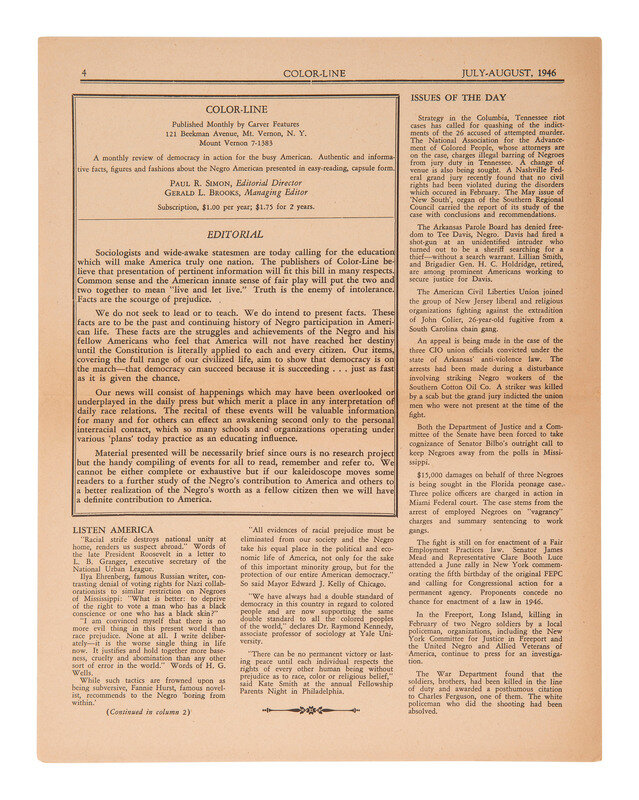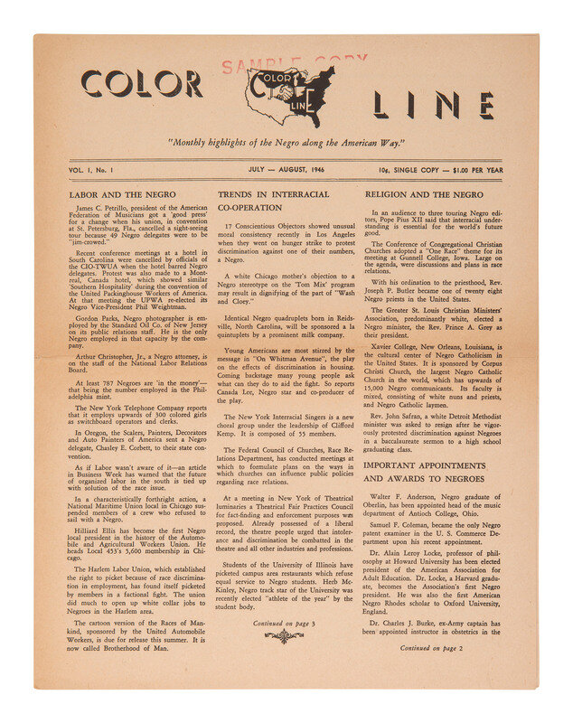 Sample copy of Color Line. Vol. I, No. 1. Mt. Vernon, NY: Carver Features, 1946. 4pp., 8 1/2 x 11 in., stamped "Sample Copy" in red above logo. Toned with minor wear to edges/corners.