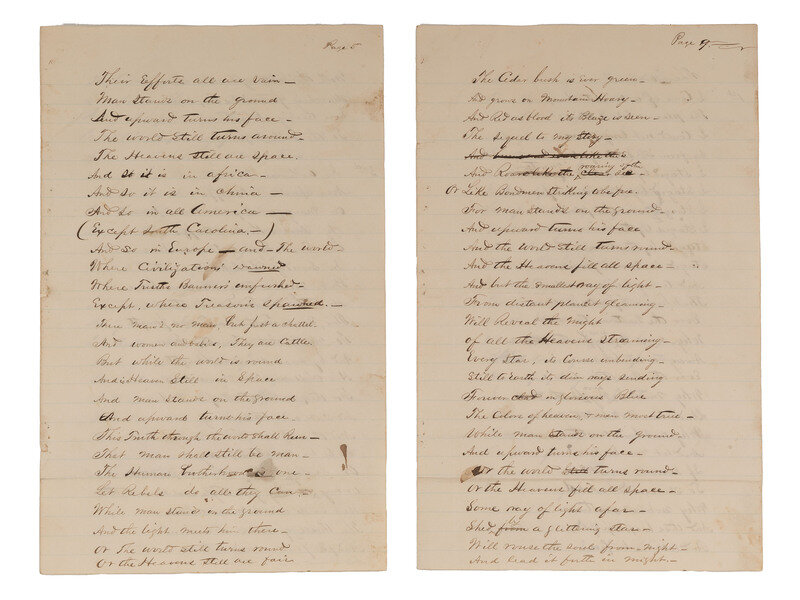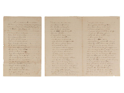 A remarkable recounting of the poetic, mystical vision articulated to Captain John Hayes, Jr., on multiple occasions by Emet Logan (ca 1825 - ?) while the two men served together in the 11th USCT. Logan, who had been enslaved prior to his enlistment, was presumably unable to read and write thereby necessitating Hayes's written recording of the vision. The manuscript is thematically divided into two parts, the first portion, seemingly a kind of preamble, is segmented into "1st," "2nd," and "3rd," with the 3rd containing a series of verses of an autobiographical nature describing Emet Logan's father and his own resolution to be free. The next portion is segmented into "1st," "2nd," and "3rd," with the 1st and 3rd both identified as "The Vision."