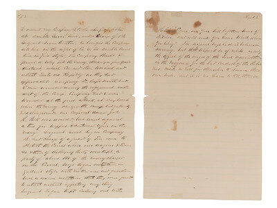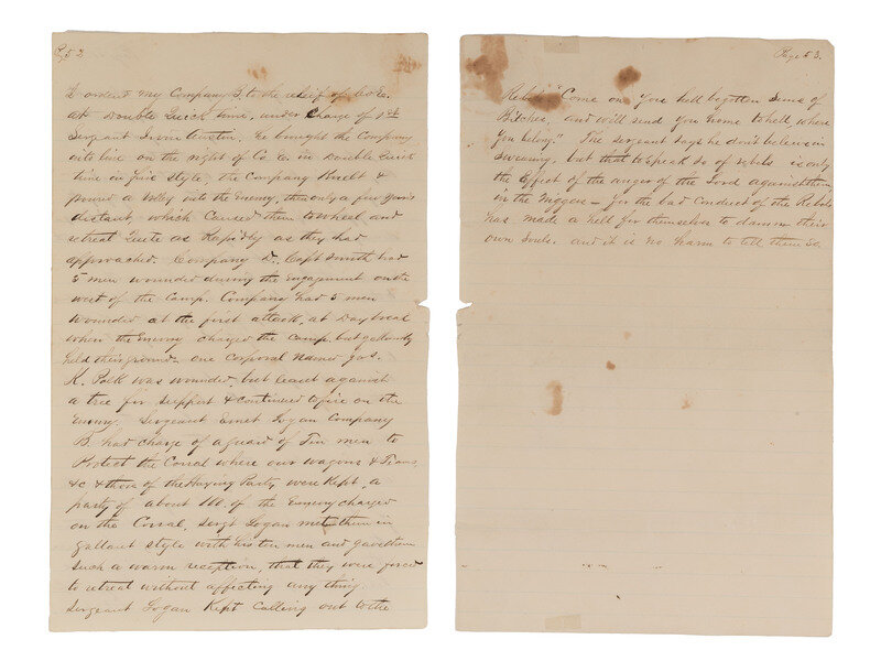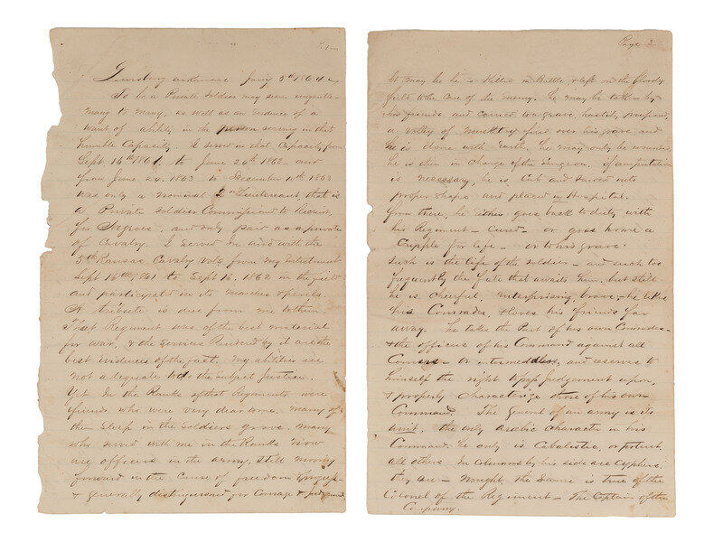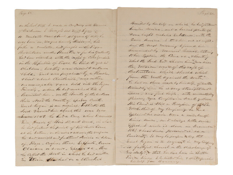 [With:] Untitled autobiographical manuscript, in the hand of Captain John Hayes, Jr., "Lewisburg, Arkansas," 5 January 1864. 53pp, approx. 8 x 12 1/2 in., on blue-lined paper. Hayes writes regarding USCT and his association with Emet Logan. Hayes describes the "Negro prophet": "On the last [recruiting] trip I made ... I Brought out Emet Logan a mulatto man about 40 years of age. he was born in Wayne County, Missouri, his father a mulatto - had fought in the Texan Revolution under Houston … [Emet's father] tried to get his children - but they were carried to Arkansas & sold. - Emet was purchased by a Preacher - & lived about Clarksville, was rather unmanageable and was sold into the Logan Family - where he remained till I Recruited him - on the Banks of the Arkansas River Near the Mouth of Spadra Creek." Hayes continues, describing Emet Logan as "an original" who "thinks the Lord Showed him about this war Ever since 1848." Hayes describes Logan's unusual cane, his manner of dress, and his physical appearance. Hayes also notes that Logan explained his vision to him "a number of times," and he recorded Logan's vision in December 1863 "as a curiosity."