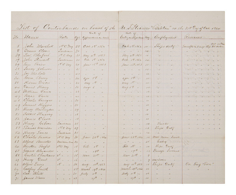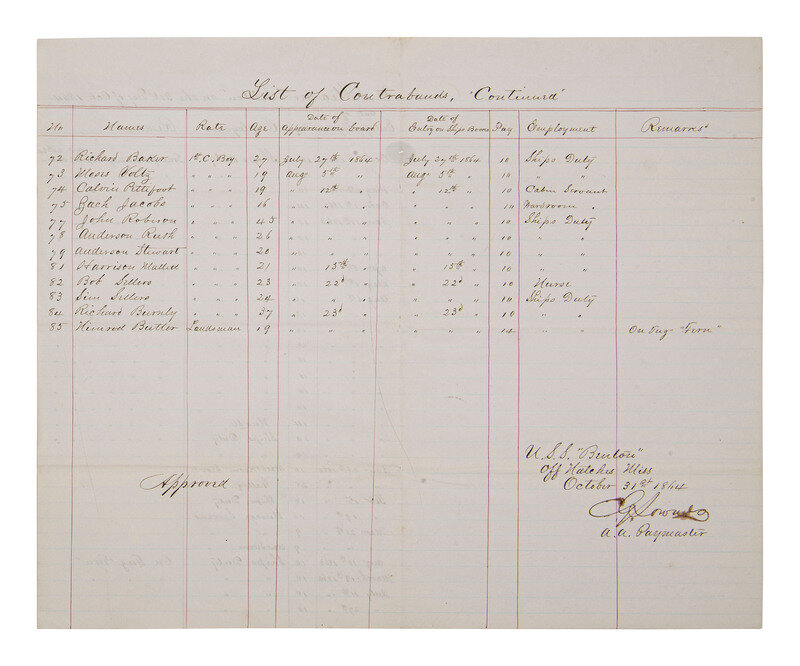 As a note of clarification, the 1864 deck log excerpts of the USS Benton are not included in this lot. They are merely referenced to provide evidence that individuals on the manuscript list featured here were actually on said ship, and in some cases listed as being "contraband" or "negro."