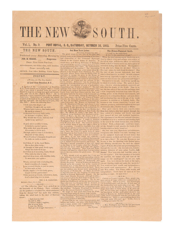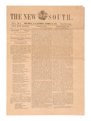 The New South. Vol. I, No. 9. Port Royal, SC: 18 October 1862. 4pp., 9 1/4 x 13 1/8 in.